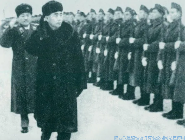 1957年1月16日,周恩来、贺龙检阅匈牙利人民军仪仗队。