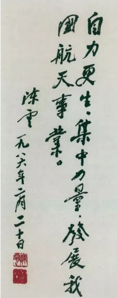 1986年2月20日,陈云为祝贺我国第三颗通讯卫星发射成功给国防科工委题词。
